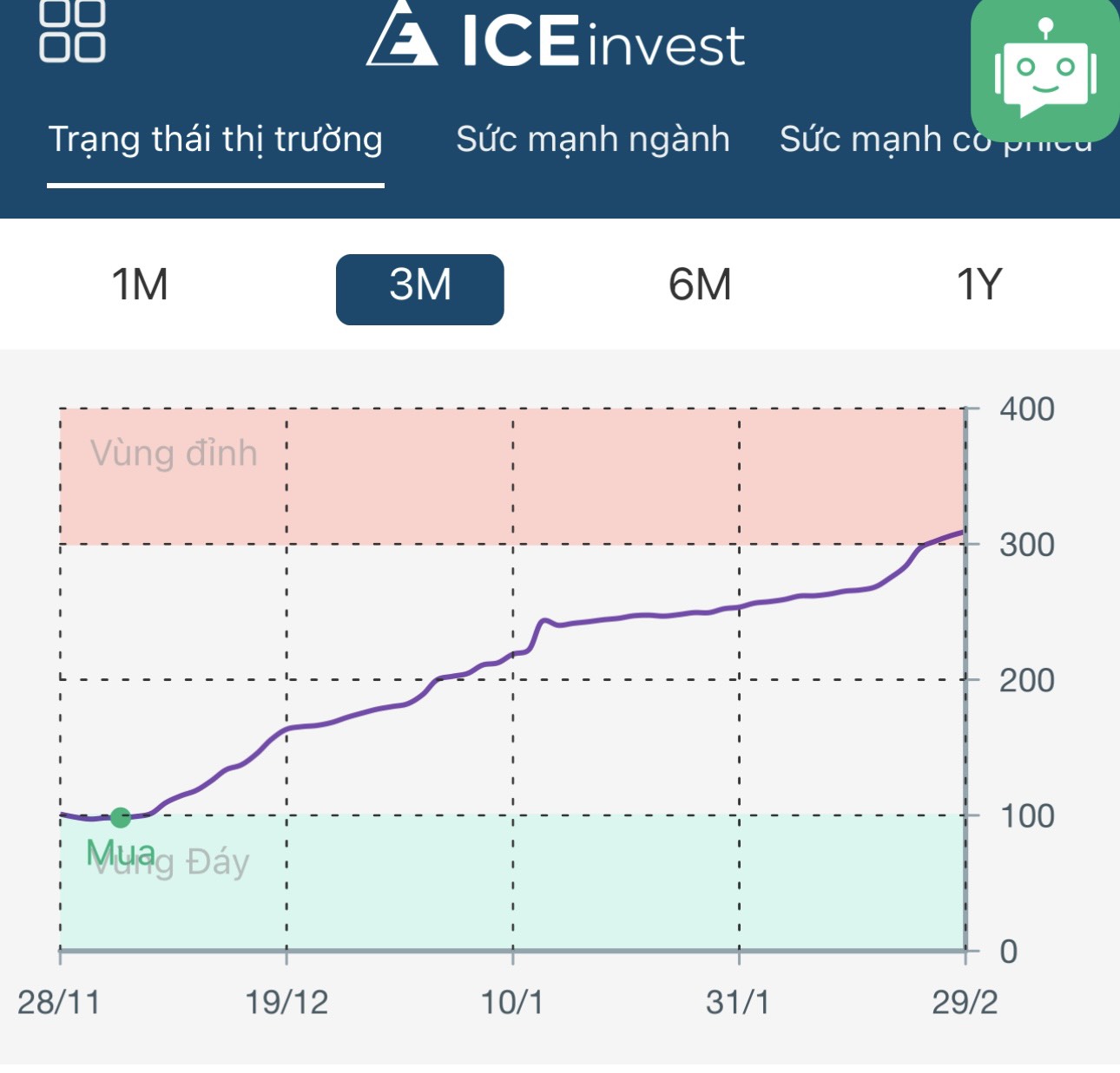 Trong phiên giao dịch ngoài thông báo các cổ phiếu có ghi nhận dòng tiền trong phiên thì ứng dụng ICEinvest sẽ có thông báo cho NĐT các cổ phiếu nào có Điểm mua theo Sức mạnh cổ phiếu để NĐT có thể tham khảo. NĐT có thể hỏi Chatbot trên ứng dụng ICEinvest vùng mua khuyến nghị từ đó quyết định mở mua cổ phiếu khi cổ phiếu về điểm mua.