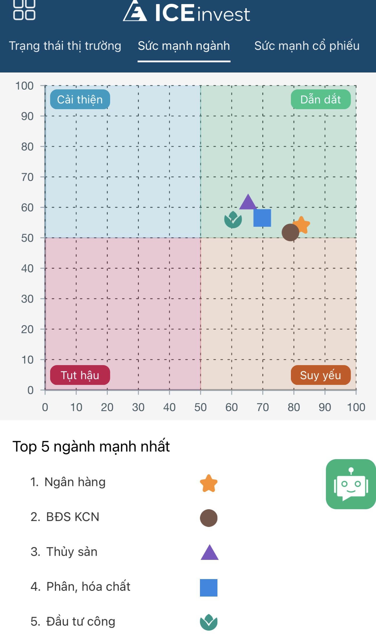 Biểu đồ Sức mạnh Ngành ICEinvest: được tính toán bằng thuật toán Trí tuệ nhân tạo (AI) để tính ra các số liệu và thể hiện bằng biểu đồ sức mạnh của 05 ngành mạnh nhất thị trường và những ngành nào có khả năng dẫn dắt thị trường khi thị trường trong xu hướng tăng (Uptrend). Theo đó, tại bất kỳ thời điểm nào trong chu kỳ Chân sóng, ICEinvest cũng chỉ ra Dòng cổ phiếu thuộc ngành nào đang là mạnh nhất Thị trường để NĐT có thể dồn tỷ trọng giải ngân tập trung vào ngành đó để tang hiệu quả đầu tư.