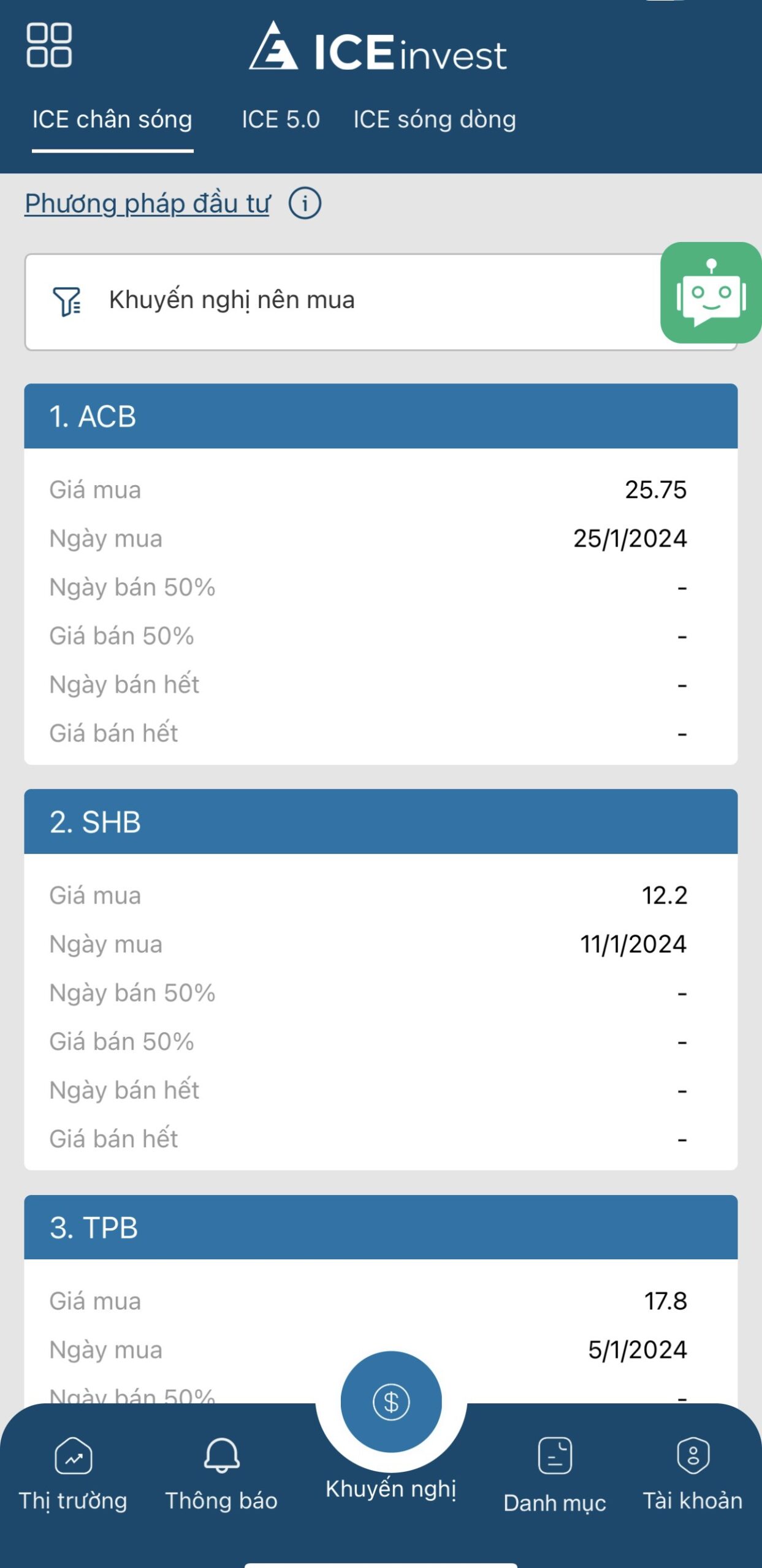 Bot ICE chân sóng: Khuyến nghị NĐT mở mua cổ phiếu tại từng chân sóng của Thị trường và tập trung giải ngân vào các cổ phiếu mạnh thuộc các dòng Cổ phiếu mạnh thu hút dòng tiền mạnh nhất tại chân sóng. Và nắm giữ Danh mục chân sóng đến hết chu kỳ tăng của Chân sóng. Bán dần từng phần cổ phiếu hạ dần tỷ trọng theo chiều tăng của Sóng.