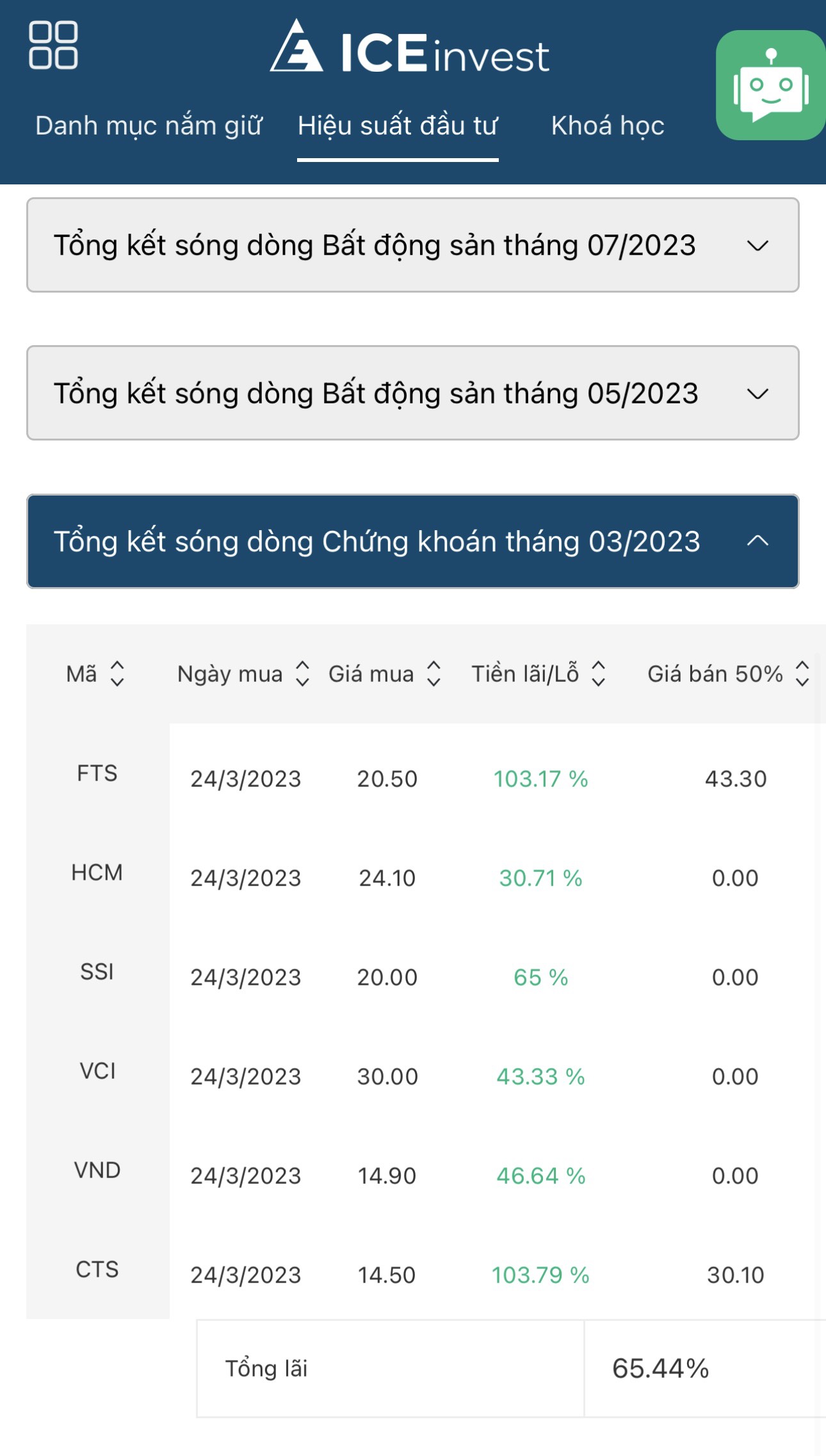 NĐT có thể xem lại hiệu suất đầu tư của từng chân sóng từ khi APP ICEinvest ra mắt và bắt đầu khuyến nghị NĐT từ chân sóng tháng 11/2022 là Đáy 870 điểm năm 2022. Với tỷ suất sinh lợi nhuận các chân sóng thành công đều đạt 40-60% lợi nhuận. Còn theo phương pháp đầu tư theo Chân sóng ICEinvest NĐT có thể kiếm lợi nhuận ổn định từ 15-20%/ chu kỳ chân sóng. Với 1 năm NĐT có thể giao dịch từ 3-4 chân sóng.