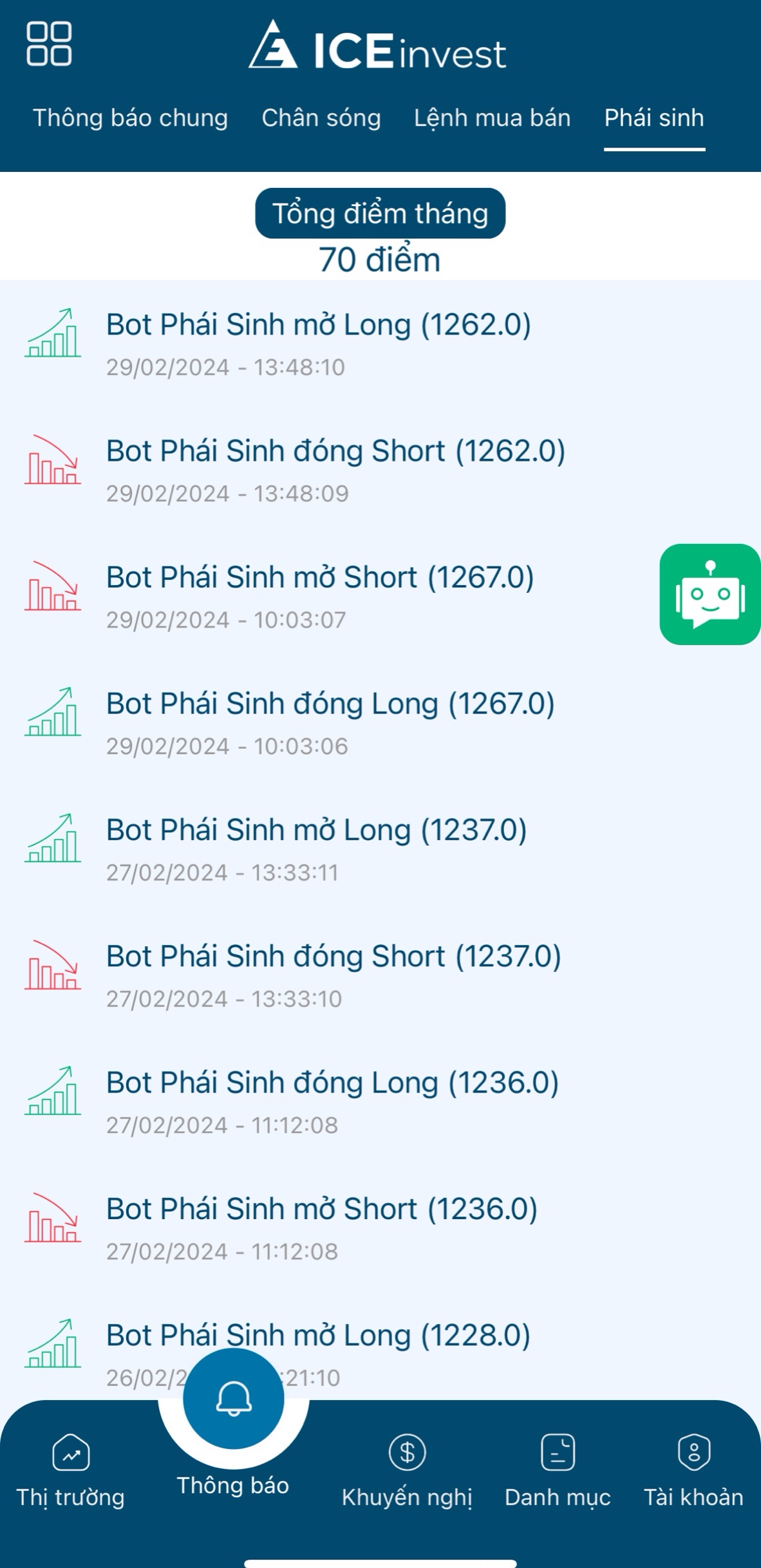 Bot Phái sinh V5.0 trên ứng dụng ICEinvest khuyến nghị NĐT các lệnh Long /Short trong phiên để NĐT có thể nắm bắt được xu hướng của Thị trường chung tăng hay giảm và mở vị thế Long Short theo khuyến nghị của Bot.