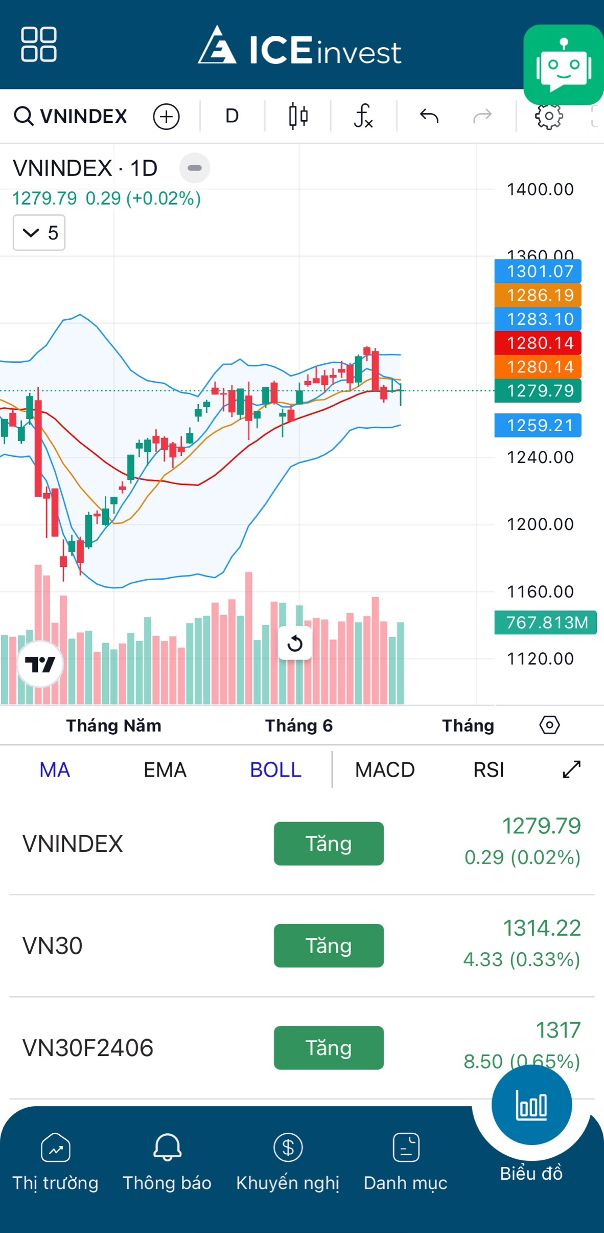 Biểu đồ kỹ thuật (Chart) hỗ trợ NĐT xem được xu hướng tăng giảm của Thị trường và các cổ phiếu. Ngoài ra giúp các NĐT theo PTKT tìm được các điểm mua bán cổ phiếu qua việc PTKT và phương pháp Price Action. Sử dụng biểu đồ kỹ thuật ICEinvest, NĐT có thể sử dụng full chỉ báo kỹ thuật như Ma, Macd, Ichimoku, RSI… mà không phải trả thêm phí.
