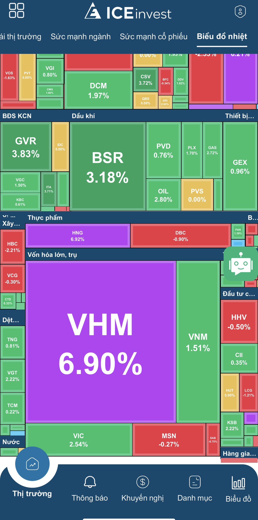 Biểu đồ Nhiệt sẽ giúp NĐT quan sát ngay trong phiên giao dịch dòng tiền đang tập trung Mua vào hay Bán ra cổ phiếu nào và Ngành cổ phiếu nào trong phiên.