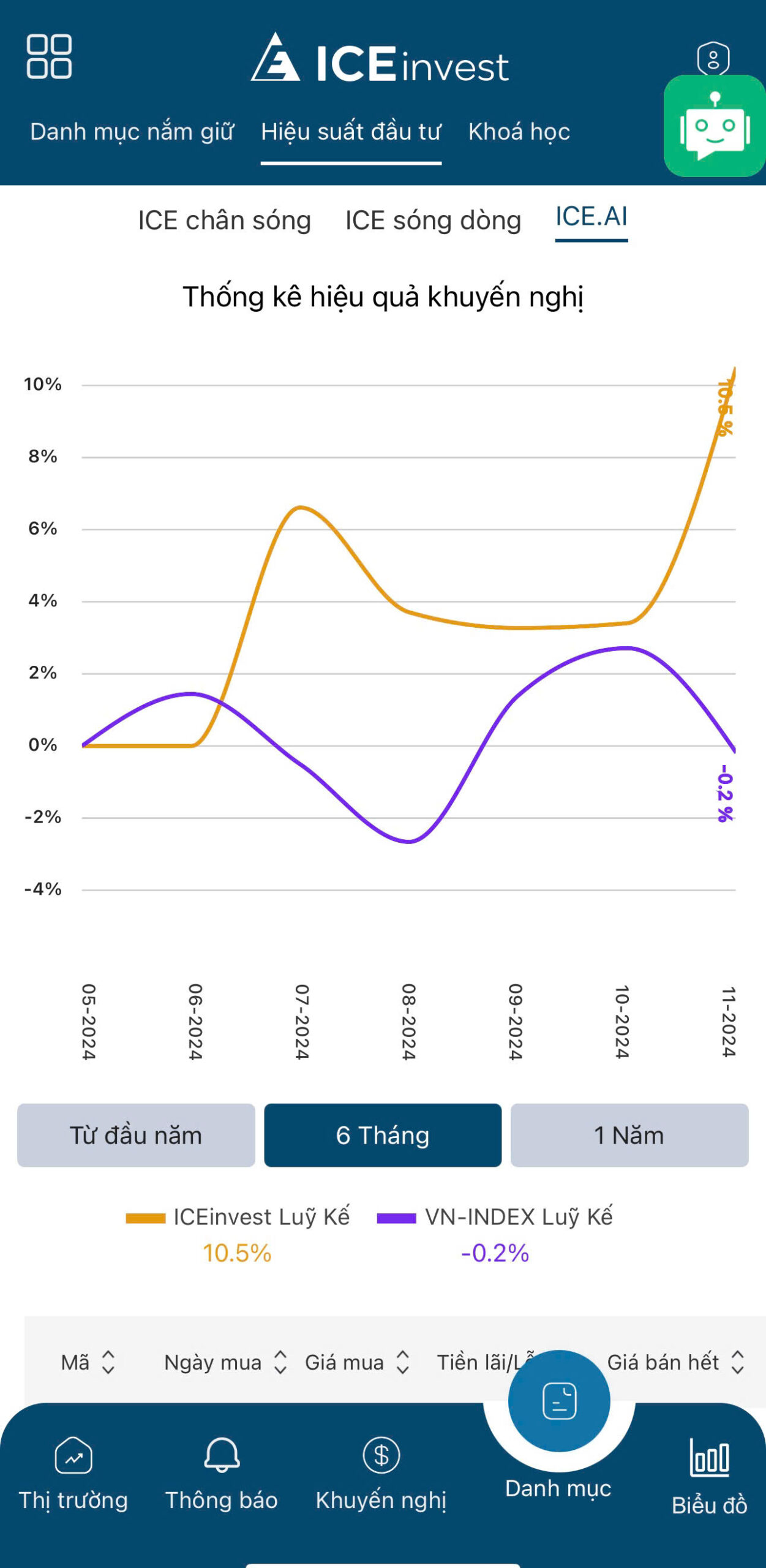 ICEinvest mới ra mắt ICE.AI là AI khuyến nghị Mua cổ phiếu theo sức mạnh cổ phiếu. Chuyên khuyến nghị NĐT mua các cổ phiếu khỏe hơn Thị trường chung và có thể tăng điểm ngược Thị trường khi Thị trường giảm điểm. Trên hình là hiệu suất của ICE.AI trong tháng 10-11/2024 VNINDEX giảm 100 điểm từ 1300 về 1200 nhưng ICE.AI vẫn có hiệu suất lợi nhuận hơn 10.5% trong 1 tháng.