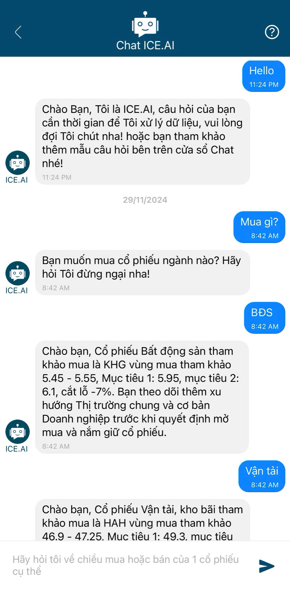 Chat ICE.AI hỗ trợ NĐT hỏi đáp điểm mua bán của tất cả cổ phiếu 24/7. Trả lời NĐT các vùng kháng cự, hỗ trợ của các cổ phiếu và Thị trường (VNINDEX). Ngoài ra Chat ICE.AI sẽ cho NĐT biết điểm chặn lãi, chặn lỗ của từng cổ phiếu đang nắm giữ, giúp cho NĐT có thể tự tin nắm giữ theo Trend tăng của cổ phiếu cho hết chu kỳ sóng tăng của cổ phiếu để có thể đạt được Siêu lợi nhuận.